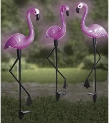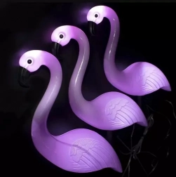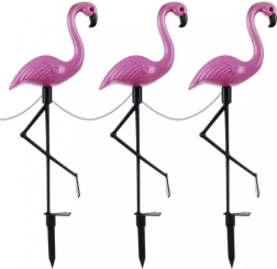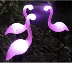 V paketu prejmete tri luči v obliki flaminga, povezane s solarnim panelom in opremljene z LED diodami za nežno osvetlitev.