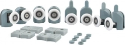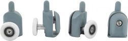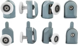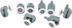 Ta komplet kolesc za pršne kabine vsebuje osem kolesc, zasnovanih za univerzalno uporabo. Vsako kolesce je opremljeno z vzdržljivim plastičnim in kovinskim mehanizmom, ki zagotavlja gladko drsenje pršnih vrat.