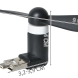 Praktičen mini ventilatorček z dvojnim priključkom 2v1 se priključi neposredno v microUSB telefona ali v običajen USB port (powerbanka, prenosnik). Energijo črpa neposredno iz porta, zato ne potrebuje baterij niti polnjenja. Za uporabo s telefonom je potrebna funkcija OTG – pred nakupom jo prosimo preverite. Ventilatorček ne deluje preko redukcij ali podaljševalnih adapterjev.