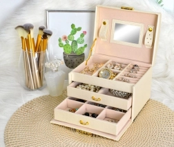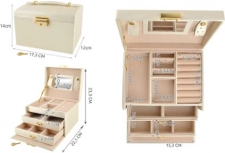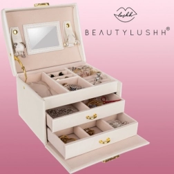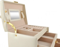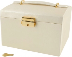 V pokrovu boste našli praktično ogledalo in trakove z zapiranjem za varno pritrditev nakita brez zapletanja. Robustna konstrukcija in kakovostna izdelava z zlatimi poudarki dajeta škatlici razkošen videz, zaklepanje na ključ pa zagotavlja zasebnost in varnost dragocenosti.