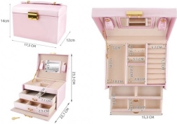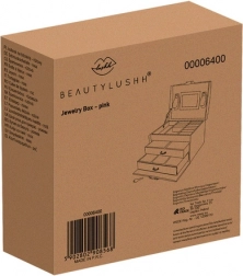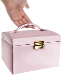 Notranjost je obložena z nežnim materialom, ki ščiti nakit pred praskami. Kovinski elementi in zanesljivo zaklepanje na ključ zagotavljajo občutek varnosti in elegance. Praktični valjčki trdno držijo droben nakit, medtem ko paščki z zapenjanjem preprečujejo zapletanje verižic. Vgrajeno ogledalce olajša hitro urejanje pred odhodom.