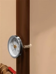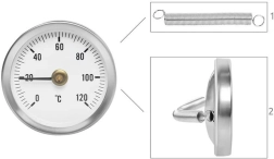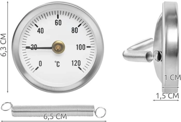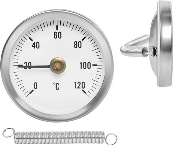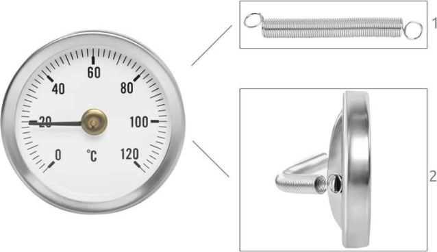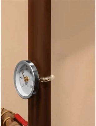 Montaža je enostavna s priloženo vzmetjo, ki se prilagodi standardnim dimenzijam cevi. Bimetalna konstrukcija izkorišča različno raztezanje kovin za premik kazalca, kar zagotavlja natančne in stabilne rezultate.