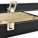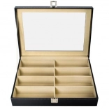 Stilski organizator za očala z 8 predalčki iz črnega eko usnja s kontrastno svetlim notranjim delom ščiti in elegantno razstavlja vašo zbirko. Zahvaljujoč prozornemu steklenemu pokrovu imate pregled brez odpiranja, mehka podloga preprečuje praskanje, kovinski zapiralni patent pa varno drži vsebino med prenašanjem.