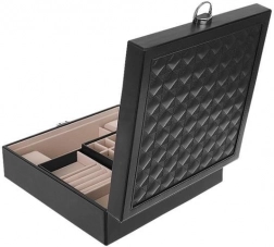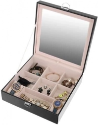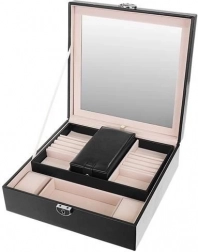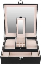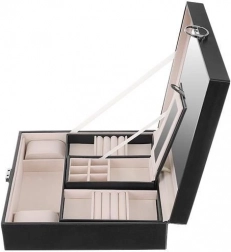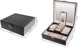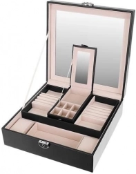 Ta škatla za nakit je odlična za vsako ljubiteljico nakita in modnih dodatkov. Ponuja večstopenjski prostor za shranjevanje, vključno z odstranljivo prenosno škatlico, kar ji daje vsestranskost in praktičnost, ki jo boste cenili na potovanjih. Ogledalo, integrirano v pokrovu, olajša nošenje nakita in prilagoditve.