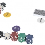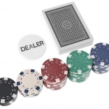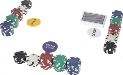 Del paketa so tudi funkcionalni žetoni DEALER, SMALL BLIND in BIG BLIND za pregledno organizacijo igre, 2× 54 kart za nemoteno rotacijo kompletov ter 5 kock za dodatno namizno zabavo. Set je idealen za domače igralnice, zabave in prijateljska tekmovanja.