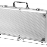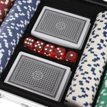 Priredite svoj poker večer s kompletom, ki ponuja vse potrebno za Texas Hold'em in druge kartne igre. Žetoni s kovinskim jedrom (10 g) prinašajo avtentičen kazino občutek – imajo prijetno težo, odlično se zlagajo in so zelo trpežni. Vse je shranjeno v čvrstem aluminijastem kovčku z penasto oblogo in natančno oblikovanimi predelki, zato vsebina ostane na mestu tudi med potovanjem.