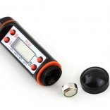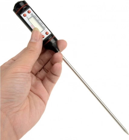 Praktičen digitalni kuhinjski termometer z LCD zaslonom in sondo iz nerjavnega jekla za hitro in natančno merjenje temperature mesa, tekočin, olj in vina. Ponuja obseg -50 do +300 °C, natančnost 1 °C, funkcijo HOLD, pomnilnik zadnje meritve in samodejni izklop. Enostavno berljiv prikaz °C/°F, napajanje z baterijo LR44 (priložena).