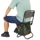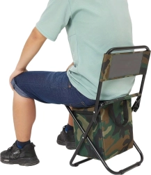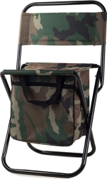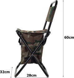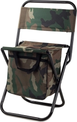 Lahek in zložljiv turistični stol v kamuflažnem slogu MORO s praktičnim naslonjalom za hrbet in integrirano torbo pod sedežem. Ponuja udobno sedenje pri ribolovu, kampiranju in na festivalih, stabilen jeklen okvir ter enostavno prenašanje zahvaljujoč ročaju in naramnicam.