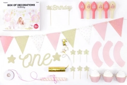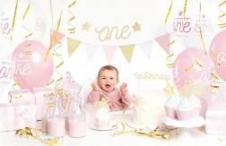 Ustvarite čarobno vzdušje na prvem rojstnem dnevu s tem kompletnim kompletom v rožnato‑zlati izvedbi. Komplet je zasnovan tako, da je okrasitev hitra, usklajena in fotogenična – idealno za družinsko praznovanje in za stile fotografije.