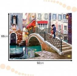 Sestavljanka prikazuje umetniško ilustracijo romantičnega mostu v Benetkah s parom na mostu. Ta motiv doda podobi čarobnost in skrivnostnost.