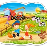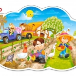 Barvite ilustracije z otroki, živalmi in dejavnostmi na kmetiji spodbujajo domišljijo in ohranjajo pozornost med sestavljanjem.