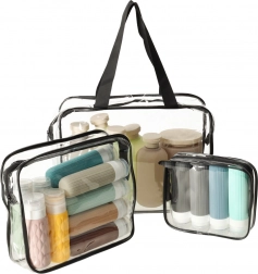 Komplet vključuje malo, srednjo in veliko torbico – od drobnih stekleničk in zdravil do kozmetike ali kopalk. Največja torbica ima praktična ročaja za udobno prenašanje. Po vrnitvi jih lahko pospravite eno v drugo in prihranite prostor pri shranjevanju.