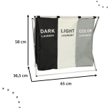 Brez dolgotrajnega prebiranja perila pred pranjem. Ta prostoren organizator ponuja 3 samostojne vreče z jasnimi oznakami za lažjo orientacijo. Skupna prostornina 135 litrov (3 × 45 l) zadošča za perilo cele družine, medtem ko se kompaktne mere 65 × 36,5 × 58 cm prilegajo tudi manjšim prostorom.