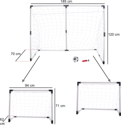 Nogometni gol za otroke 2v1 je idealna pomoč za male športnike, ki spodbuja njihovo fizično aktivnost in zabavo na svežem zraku. Prenosna in enostavno sestavljiva konstrukcija omogoča enostavno manipulacijo in hitro postavitev v en velik ali dva majhna gola.