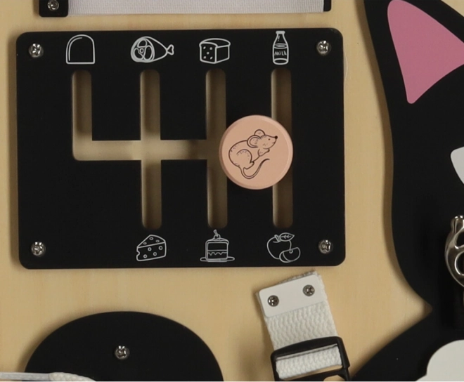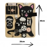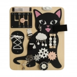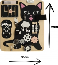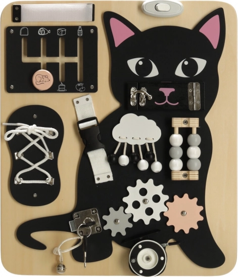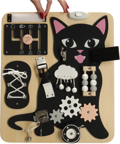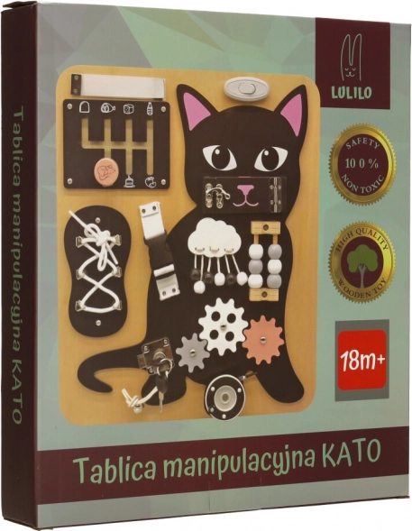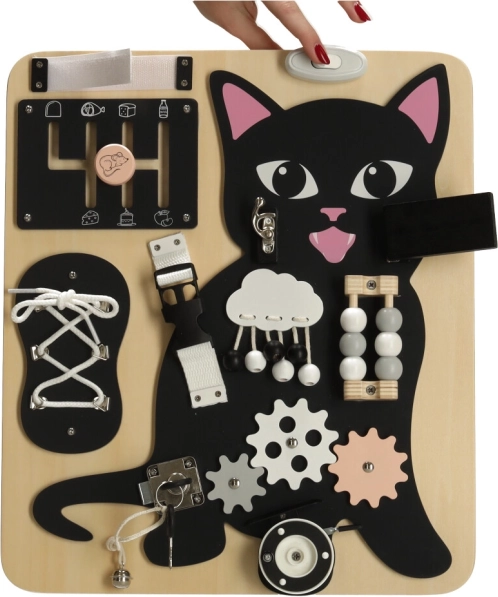 Tabla Lulilo v obliki mačke je priljubljena izobraževalna igrača za otroke, ki jih spodbuja k vrtenju, vlečenju, vezanju in premikanju. Pomaga jim razvijati fino motoriko, natančnost gibov in moč v rokah. Zabavne uganke in naloge stimulirajo kognitivne sposobnosti majhnih otrok in jim prinašajo zadovoljstvo ob uspehih.