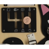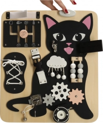Kombinacija črne mucke s svetlimi lesenimi detajli privablja pozornost in otroka zabava dolge ure.