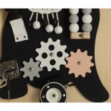 Z uporabo interaktivnih elementov, kot so prestave, ključavnice in vezalke, se otroci učijo fine motorike in si izboljšujejo natančnost gibov rok.