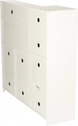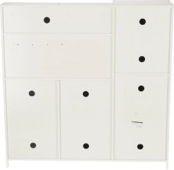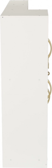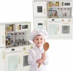 Bela lesena konstrukcija s kovinskimi dodatki, kot so lonec, ponev in kuhinjski pripomočki, omogoča vsestransko uporabo in je stilski dodatek otroški sobi.