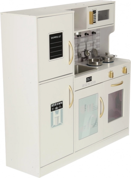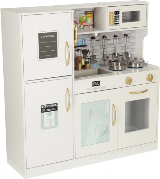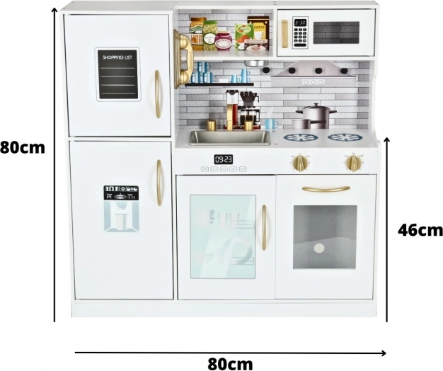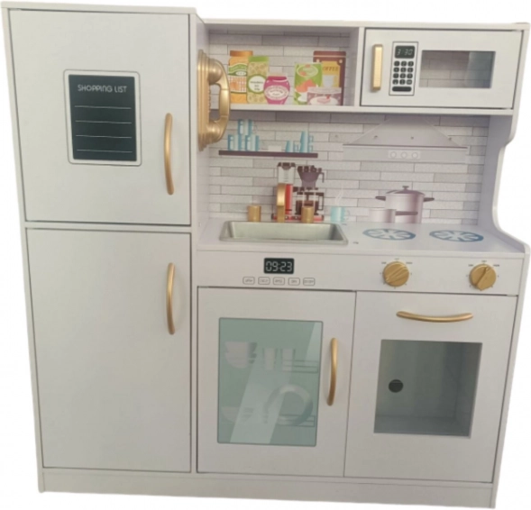 Kuhinijca vključuje hladilnik z zamrzovalnikom, pomivalni stroj, mikrovalovno pečico, štedilnik in pečico, zaradi česar je realistična in interaktivna. Na hladilniku je celo telefon za klicanje po družinske recepte. Dizajn kuhinjice z belo barvo in zlatimi elementi se odlično poda v vsako otroško sobo.