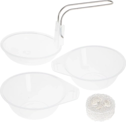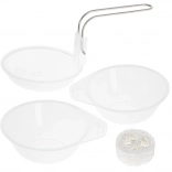 Vključuje ponev, lonec, zajemalko, posodice, leseno lopatico in čistilno gobico, kar olajša pripravo in serviranje obrokov.