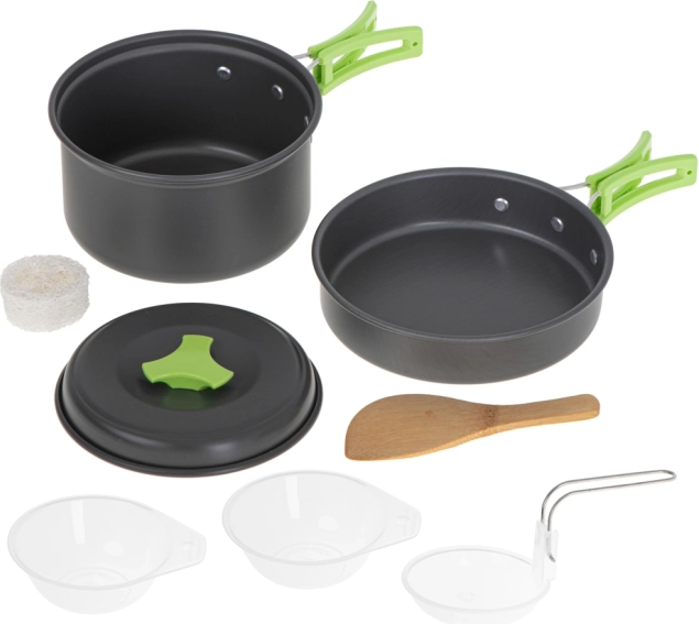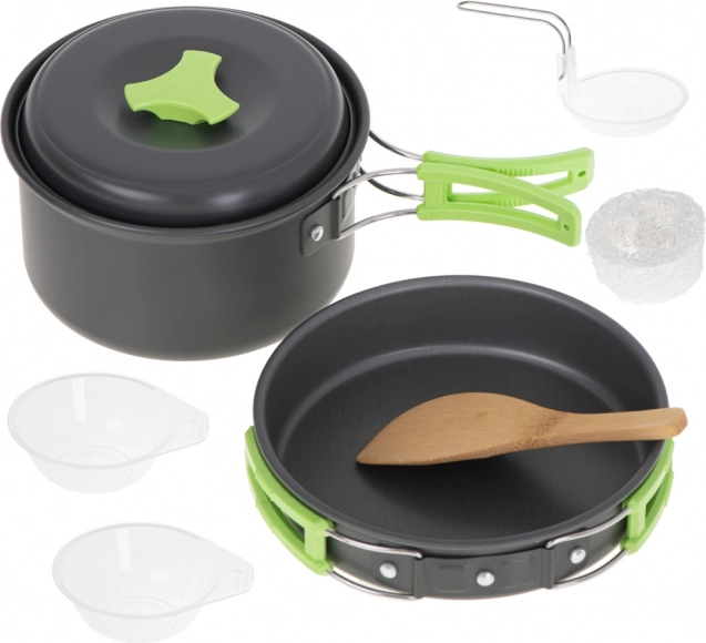 V kompletu najdete ponev, lonec in pokrov, ki so narejeni iz aluminija za hitro in učinkovito kuhanje. Dve posodici za deljenje hrane, lesena lopatica za mešanje in zajemalka omogočajo enostavno in udobno pripravo toplih jedi.