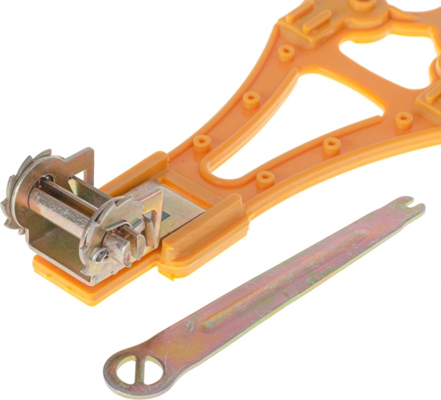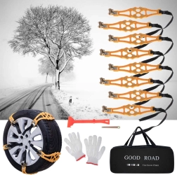 Montažo opravite v hipu: trak napeljete skozi platišče, zategnete s kovinsko zaponko in postopek ponovite na več točkah po obodu pnevmatike. Komplet je priložen v trpežni prenosni torbi ter vključuje rokavice in strgalo za steklo za udobno uporabo na terenu.