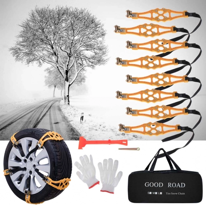 V paketu prejmete 8 protidrsnih trakov, rokavice, strgalo in trpežno prenosno torbo. Vse je pregledno pospravljeno v prtljažniku in pripravljeno za uporabo.
