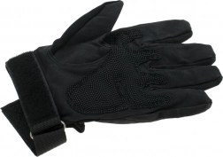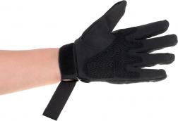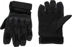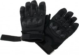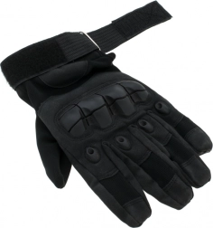 Te črne taktične rokavice so zasnovane za zahtevne pogoje. Plastne ojačitve na dlani izboljšujejo zanesljivost oprijema in ščitijo najbolj obremenjena mesta pred drgnjenjem ali prerezom. Trdo oblazinjenje na hrbtni strani roke ščiti členke pred udarci, medtem ko nastavljiv trak na zapestju zagotavlja stabilno in varno prileganje brez neprijetnega premikanja.