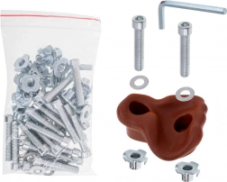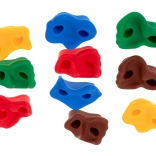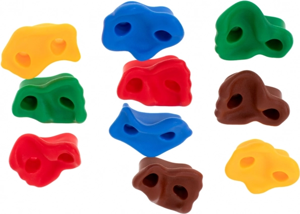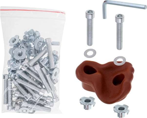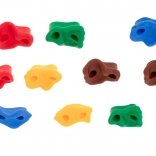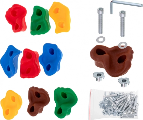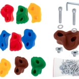 Montaža je enostavna in hitra – v paketu je popoln komplet montažnega pribora. Oprimki imajo grob površinski sloj za zanesljiv oprijem in zaobljene robove za večjo varnost. Idealno za domače plezalne stene, vrtna igrala in otroške sobe.