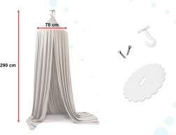 Sivi viseči baldahin je čudovit dodatek za otroško sobo, ki interierju doda udobje, zasebnost in čarobno atmosfero. Zaradi mehke, lepo padajoče tkanine je odlična izbira nad posteljico, igralno blazino ali v bralnem kotičku.