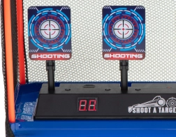 LED-zaslon šteje točke, po zrušitvi vseh treh tarč pa se cilji samodejno dvignejo – tekoča akcijska igra brez ročnega nastavljanja.