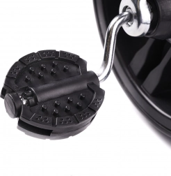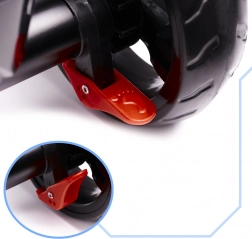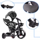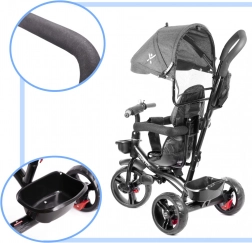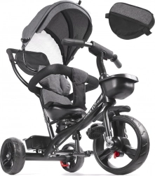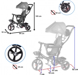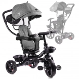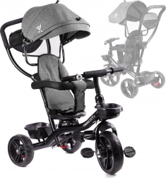Za varnost skrbijo zložljive opore za noge, varnostni lok in pas. Starši bodo cenili vrtljiv sedež 360° za očesni stik ali odkrivanje sveta v smeri vožnje ter potisni ročaj z udobnim oprijemom za natančno vodenje. Prosto kolo (prosti tek) omogoča, da kadarkoli prevzamete nadzor z enim stikalom.