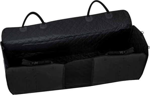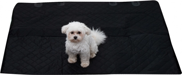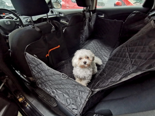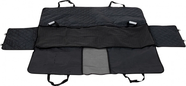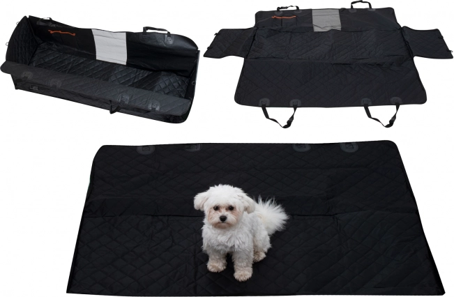 Velika univerzalna avtomobilska odeja v obliki zaščitnega boksa se hitro pritrdi na naslone za glavo s pomočjo nastavljivih trakov in zanesljivo prekrije celoten prostor zadnjih sedežev. Zadrge na straneh omogočajo dvig bočnic in ustvarjanje zaprtega prostora, tako da pes ne skoči ven ob odpiranju vrat. Vodoodporna in enostavno čistljiva površina ohranja notranjost čisto tudi po izletih v dežju ali po gozdu.