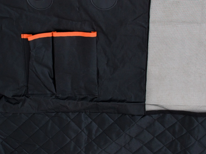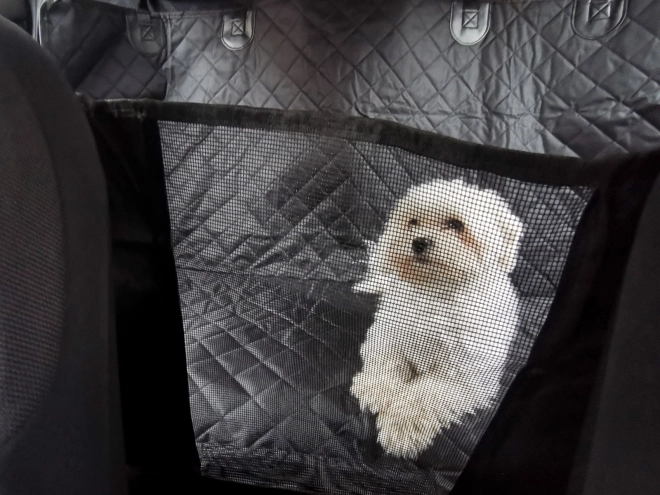 V prednjem delu je mrežast vložek, ki izboljša pretok zraka in psu omogoča, da vas in cesto vidi, ne da bi poskušal preiti na sprednje sedeže. Spodnja stran je iz protizdrsnega materiala za stabilnost, ne manjkajo odprtine za varnostne pasove in dva praktična žepa za povodec ali priboljške. Zahvaljujoč trpežnim materialom in kovinskim obročkom lahko pregrinjalo dodatno pritrdite na ročaje nad vrati za dodatno varnost.