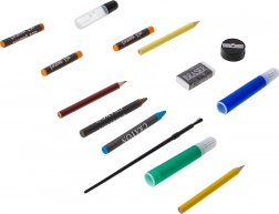 Vključen je čopič, svinčnik, šilček, radirka in lepilo. Vsak element je skrbno shranjen in pripravljen za uporabo, kar olajša vaše delo.