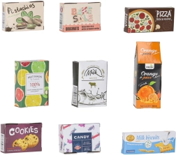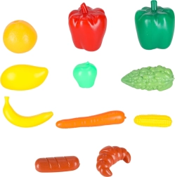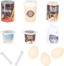 Komplet vsebuje bogat izbor živil – sadje, zelenjavo, pekovske izdelke in kartonske škatlice, ki posnemajo prave izdelke. Terminal in čitalnik oddajata pristne zvoke, kar igro naredi še bolj realistično. Celoten set je izdelan iz kakovostne plastike in kartonskih dodatkov, z poudarkom na detajlih in varnosti.
