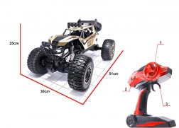 Uživajte v dinamični vožnji z impresivnim RC modelom dolžine 51 cm. Zahvaljujoč pogonu 4×4, velikim kolesom in prožnemu podvozju zlahka premaguje luknje, kamne in visoko travo. Ergonomičen pištolski upravljalnik lepo sede v roko in omogoča natančno vodenje v terenu.