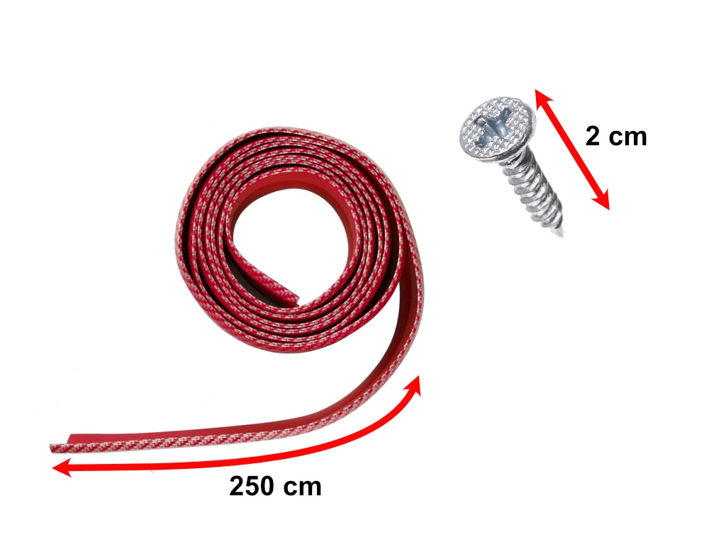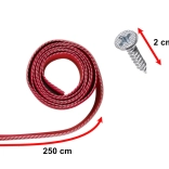 Vsebina pakiranja: trak (2,5 m), 4× vijak, čistilni robček. Namenjeno za gladke površine; življenjska doba je odvisna od kakovosti lepljenja.