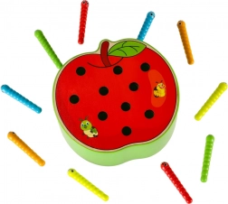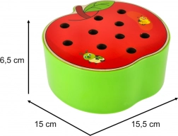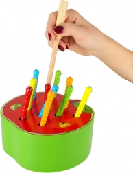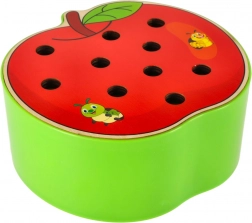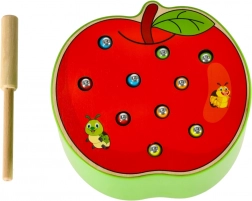 Magnetna paličica in luknjice v jabolku spodbujajo otroke k natančnim gibom ter naravno krepijo koordinacijo roka–oko in potrpežljivost.