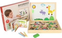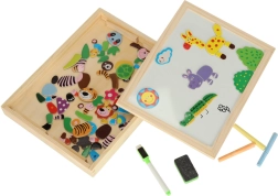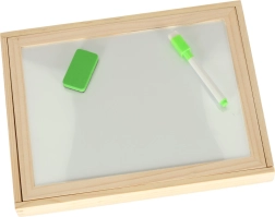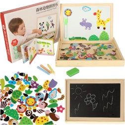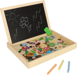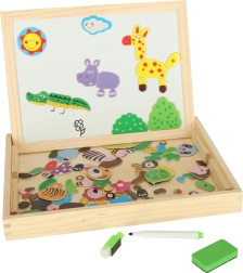 Ta dvostranska tabla otrokom ponuja veliko možnosti za razvijanje njihove ustvarjalnosti. Na beli magnetni strani lahko sestavljajo barvne sestavljanke ali rišejo s flomastrom, medtem ko je črna kredna stran namenjena klasičnemu risanju s kredo.