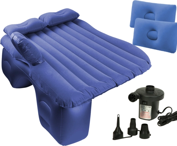 Napihljiva avtomobilska vzmetnica 130×80 cm z oporo, električno črpalko, 2 vzglavnikoma in torbo. Udobno spanje v avtu, nosilnost do 300 kg.