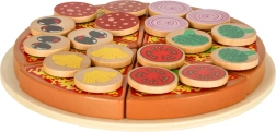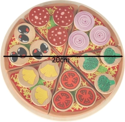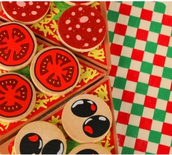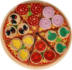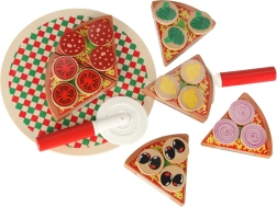 Vsebuje 6 kosov pice, 18 različnih lesenih prelivov, nož, lopatko in krožnik. Otroci lahko sestavljajo najljubše kombinacije in postrežejo celotni družini.