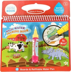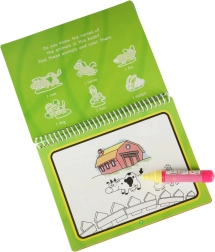 Vodne pobarvanke s čarobnim flomastrom so odličen način, kako otrokom ponuditi ustvarjalno zabavo brez madežev in brez potrebe po barvicah ali barvah. Ko s flomastrom, napolnjenim z vodo, potegnete po strani, se takoj razkrijejo žive barve in igrive ilustracije s kmetije – kravice, konjički, kokoške in druge.