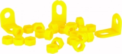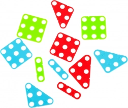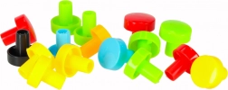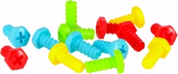 Komplet barvnih vijakov, gumbov in oblik omogoča sestavljanje cvetlic, živalic in geometrijskih vzorcev ter uči prepoznavanja barv in oblik.