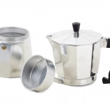 Robustna konstrukcija in udoben ergonomski ročaj omogočata enostavno rokovanje in varno uporabo. Naprava je sestavljena iz treh delov: spodnje posode za vodo, lijaka s sitom za mleto kavo in zgornje nalivne posode za končno pijačo.