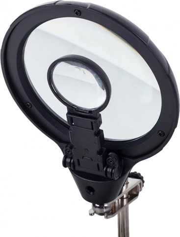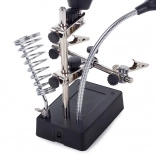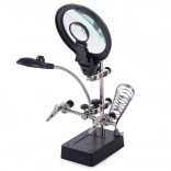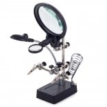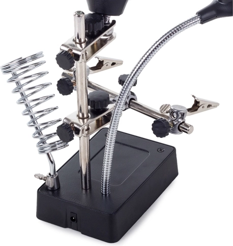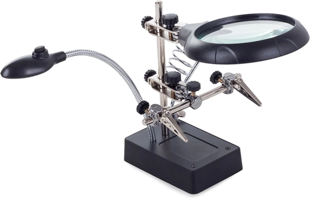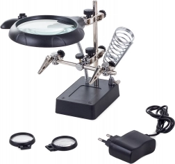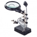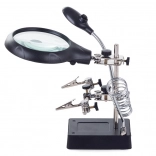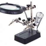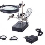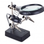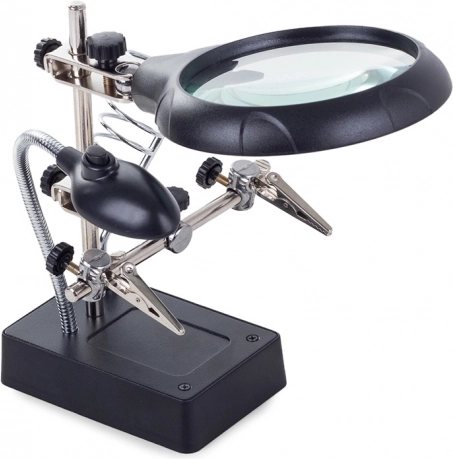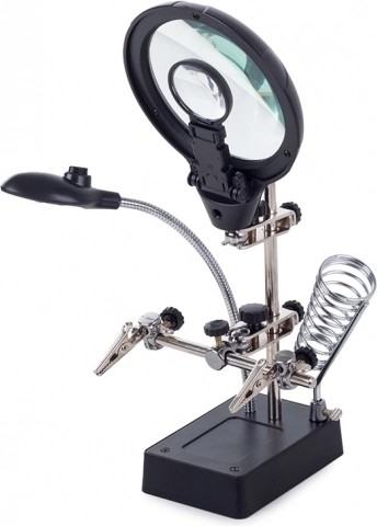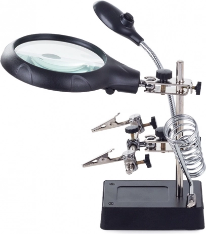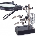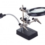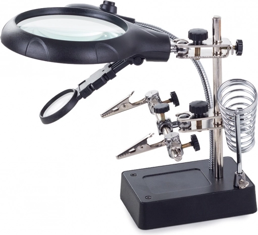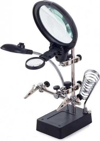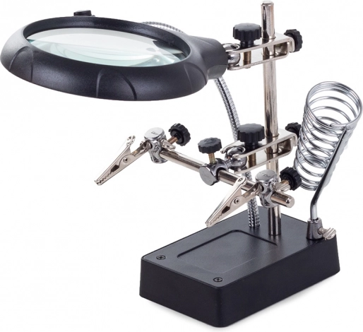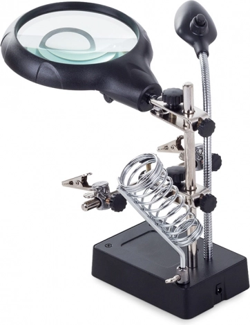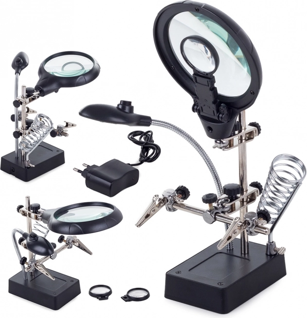 Ta montažni nosilec »tretja roka« je nepogrešljiv pomočnik za elektronike, zlatarje in modelarje. Velika lupa 2,5× (90 mm), dopolnjena z dvema dodatnima lečama 7,5× in 10×, nudi čist in jasen prikaz. LED osvetlitev na gibljivem »gosjem vratu« osvetli delovno površino natančno tam, kjer je potrebno.