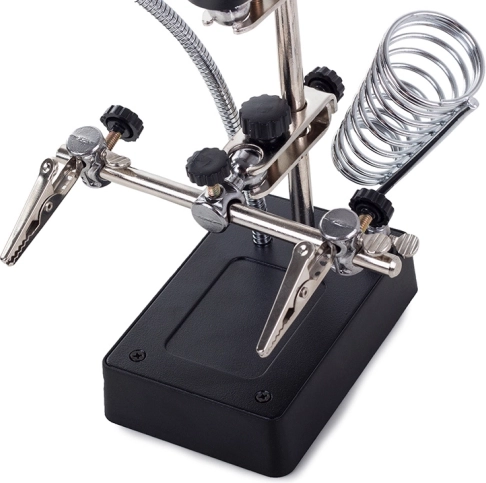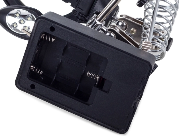 Praktična tretja roka z veliko lupo 2,5× (90 mm), dvema dodatnima lečama in 5× LED lučmi olajša natančno delo pri spajkanju, lepljenju in popravilih. Stabilno stojalo, močne krokodil sponke in prilagodljivi sklepi zagotavljajo čvrst prijem delov, medtem ko spiralno stojalo za spajkalnik in možnost napajanja z AA baterijami ali napajalnikom povečujeta udobje in varnost.