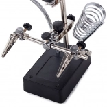 Robustne kovinske ročice z močnimi krokodil sponkami in povsem nastavljivimi sklepi fiksirajo drobne komponente. Stabilno stojalo s prostorom za čistilec konice in spiralno stojalo za spajkalnik zagotavljata varno in urejeno delovno okolje. Napajanje je možno z 3× AA (niso priložene) ali priloženim napajalnim adapterjem 5 V / 1 A.