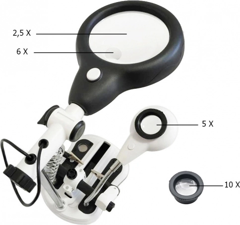 Velika leča s premerom 10,4 cm in manjša zamenljiva leča 2,8 cm ponujata povečave 2,5x, 5x, 6x in 10x za podrobno delo na elektroniki in mehaniki.