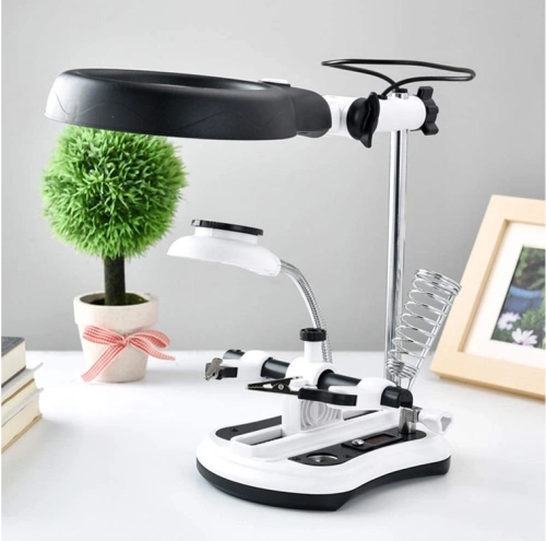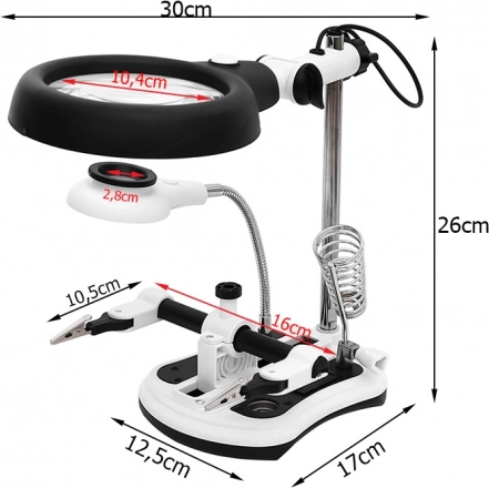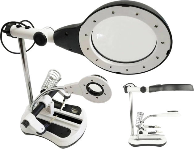 Večnamenska lupa z držalom tretje roke za natančno spajkanje in popravila. Ponuja povečavo 2,5x/5x/6x/10x, 12 + 6 LED z dvema nivojema svetilnosti ter stabilno osnovo z organizatorji. Zahvaljujoč nastavljivim rokam, krokodil sponkam in držalu za spajkalnik je idealna za elektroniko, urarstvo in natančna maketarska dela.